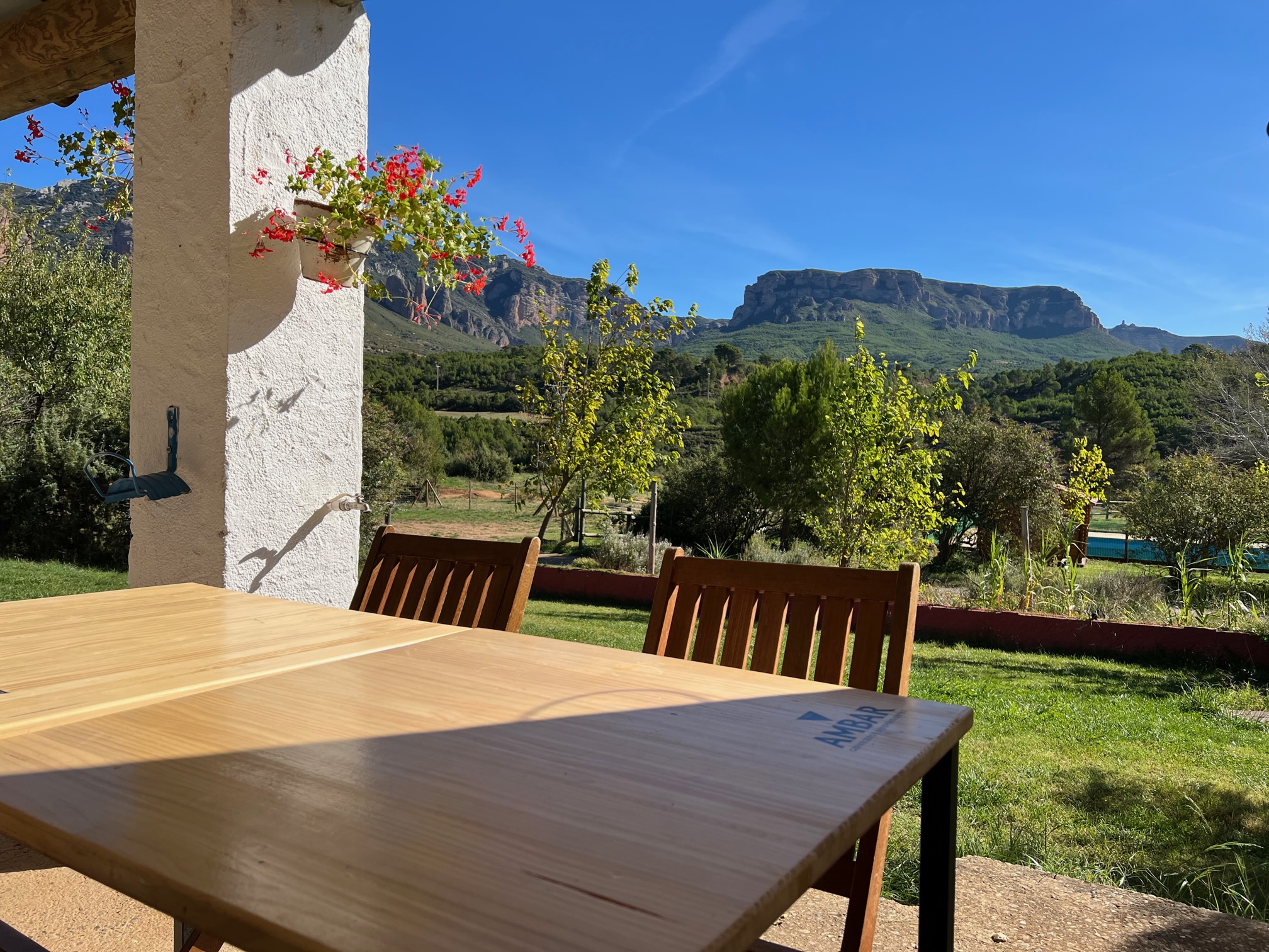 Un porche sombreado delante con mesa y sillas.